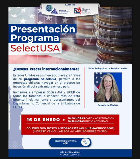 El 16 de enero de 2024, se llevó a cabo la presentación del Programa SelectUSA, con la notable presencia de la Embajadora de Estados Unidos de América en Chile, la Sra. Bernadette M. Meehan. En este evento, participaron la abogada de E|g, doña Isabella Astroza Rios, el Sr. Hugo Ferroggiaro Peñafiel, Secretario del directorio de E|g, y el Sr. Pablo Schultz Guadaroli, Presidente del directorio de E|g. Durante este encuentro, nuestro equipo tuvo la oportunidad de compartir con la Asociación de Industriales de Antofagasta y diversos empresarios chilenos que cuentan con inversiones relevantes en el mercado estadounidense.
